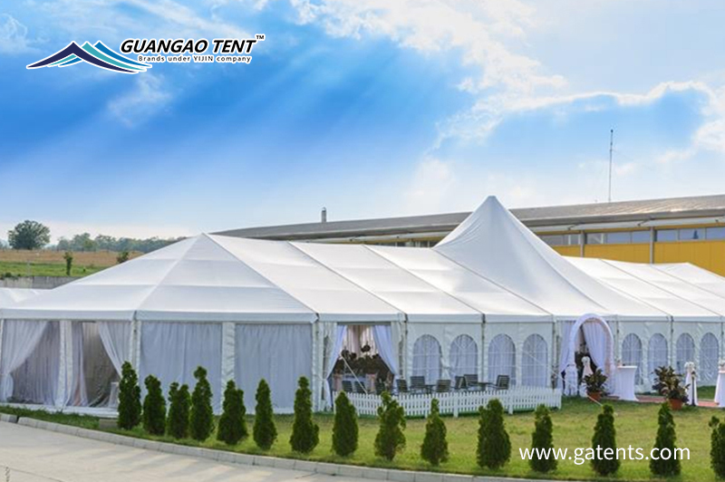 La portée maximale de la tente combinée Guangao est de 65 mètres et la bache sélectionnée est de 850 grammes / mètre carré.La structure interne de la tente présente de solides performances de sécurité, ce qui convient aux mariages, célébrations, fêtes, expositions, banquets, etc. Il présente des avantages fonctionnels et une apparence unique.